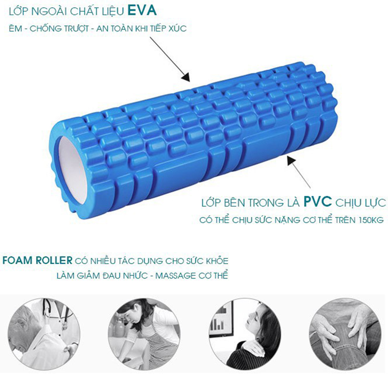 - Ống Lăn Massage Foam Roller giúp thư giãn và giảm đau cơ bắp hiệu quả. Trước và sau những buổi tập luyện hoặc những khi đau nhức, bạn nên sử dụng sản phẩm Con lăn Massage để kích thích cơ bắp, giảm đau cơ bắp, giảm đau lưng, lưu thông máu, tránh thoái hóa cột sống….